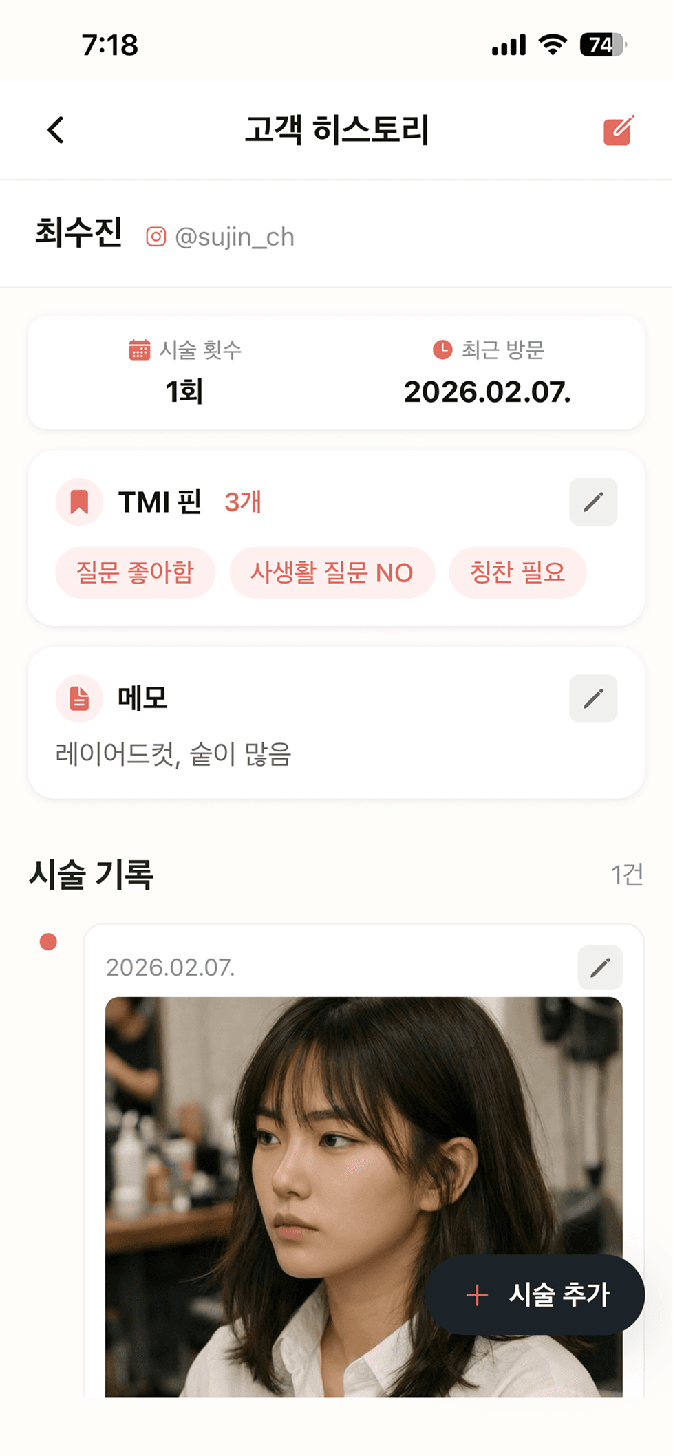 “고객별로 시술 히스토리랑 메모를 타임라인처럼 쌓아두니까 재방문 때 설명이 거의 필요 없네요. '그때 뭐 했지?'가 사라져서 상담이 훨씬 깔끔해졌어요.”